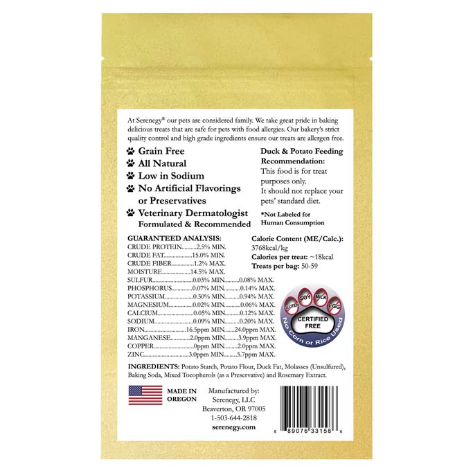 Our tasty potato, molasses and duck fat cookies are baked in the USA with only USDA and FDA approved, top quality, bakery supply ingredients. All dogs love them whether or not they have food allergies; however, Serenegy, LLC treats can be used safely with elimination/challenge diets offered by veterinarians because of our strict ingredients and baking process.
