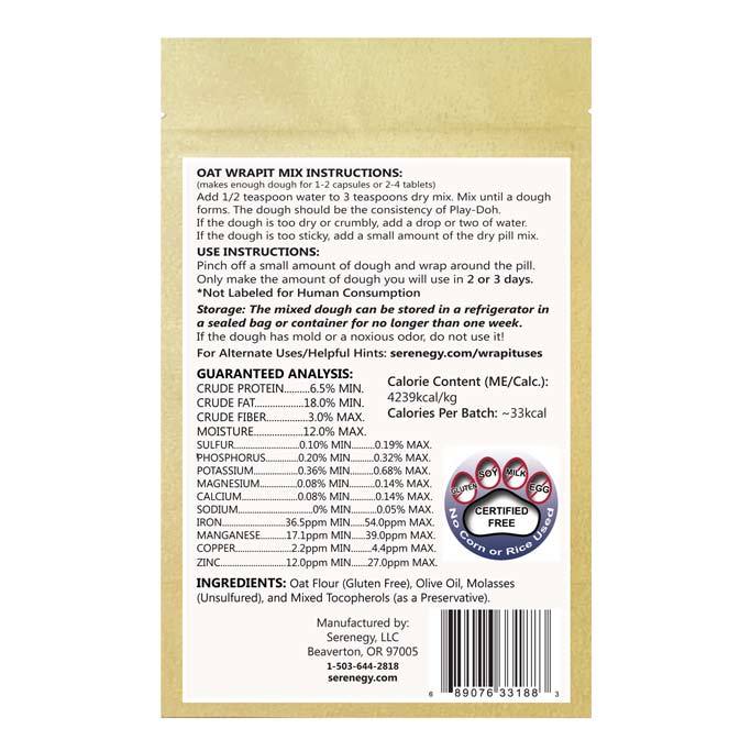 Oat WrapIt® comes as a dry powder. The five ounce bag makes approximately 25-30 capsule wraps or approximately 50-60 tablet wraps *as compared to Greenies® Pill Pockets®.