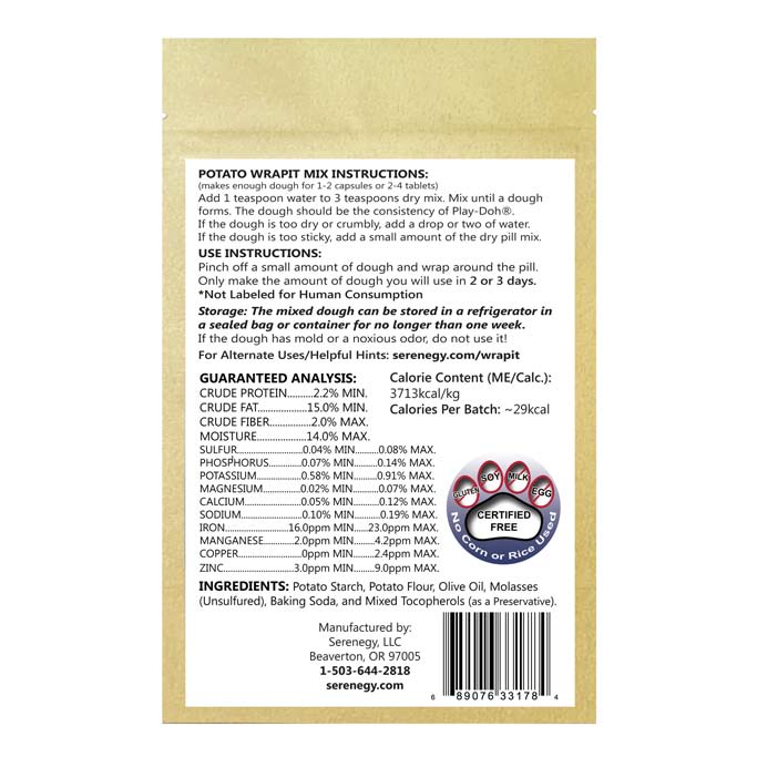 Potato WrapIt® comes as a dry powder. The five ounce bag makes approximately 25-30 capsule wraps or approximately 50-60 tablet wraps *as compared to Greenies® Pill Pockets®. You must ADD WATER to make into pill wraps.